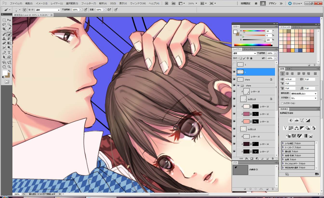 以前も、乗算、覆い焼きなどは使用禁止!彩色はHSBのみで選択という自己規制で絵書いてました。どうもやりすぎる感があるようで。